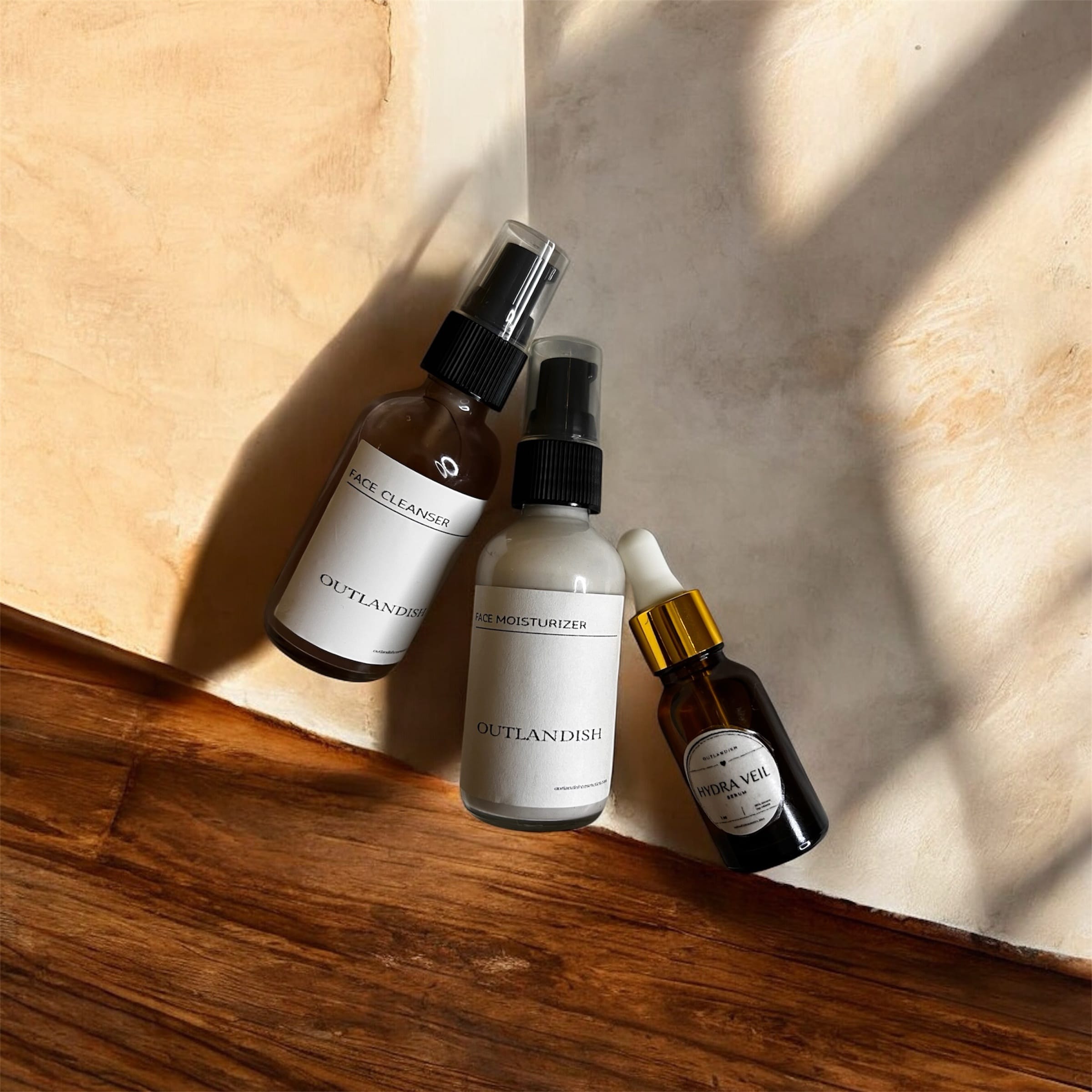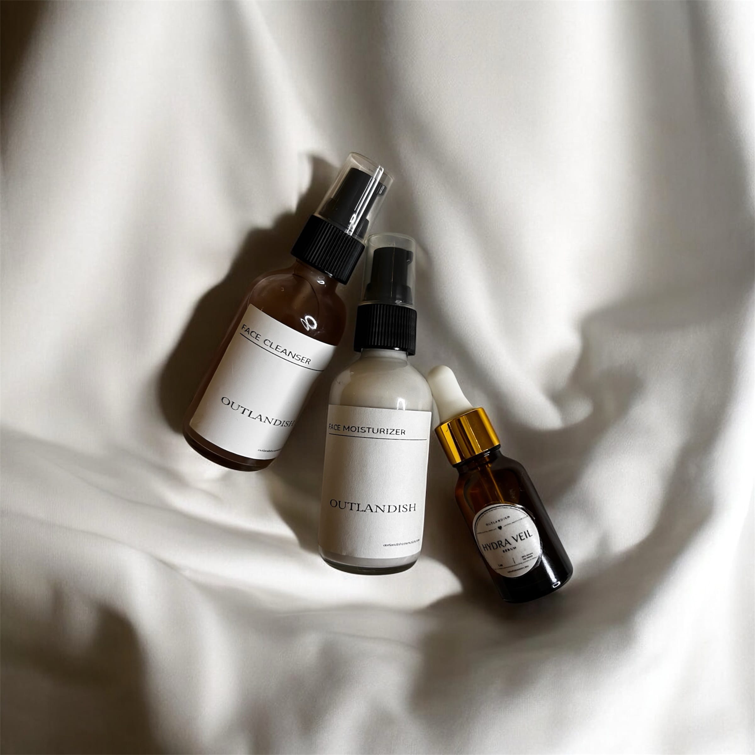 Outlandish Hydra Bloom Set is Infused with hibiscus—known for its natural exfoliating and antioxidant properties—this kit helps brighten the complexion while supporting skin elasticity. Paired with a lightweight moisturizer and a hyaluronic serum, this ritual locks in moisture and restores balance without feeling heavy.
