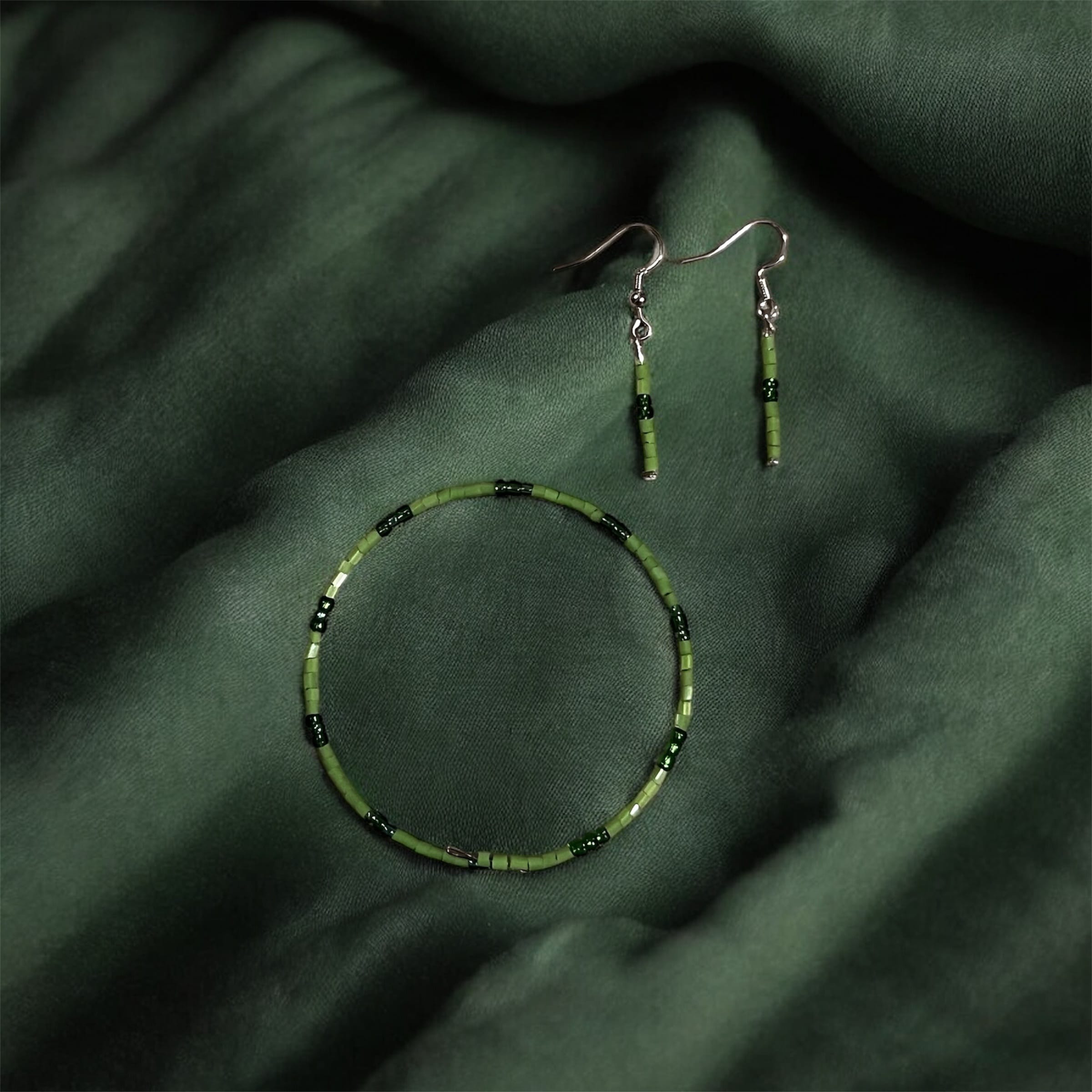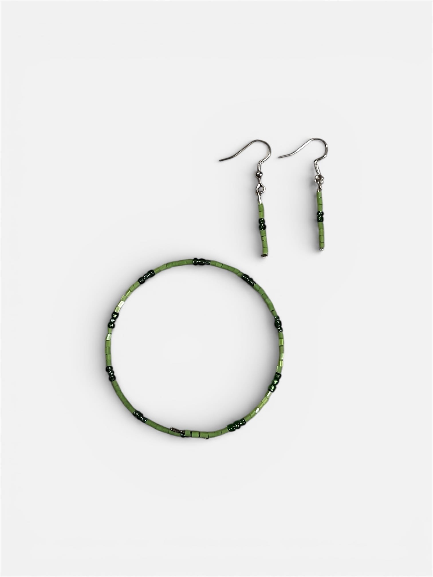 A sleek, handcrafted green beaded bracelet and earring duo-simple, refined, and timeless.